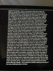 • The significant importance of driving education is to inform new upcoming drivers on how to drive properly with safety measures at all times. This can help reduce the numbers of deaths as a result of driving.The Department of Motor Vehicles driver’s manual to driving is a user-friendly tool to guide and teach the rules of becoming a safe and sufficient driver. The importance of Drivers education increases road safety, statistics show that teens who do not enroll in a driving school are 75% more likely to violate rules and get a ticket, 24% more likely to be involved in fatal accidents or death, and 16% more likely to get into an accident. This is significant information, for all drivers. The importance of drivers education guidelines are to help make the drivers more knowledgeable about road safety, and to help prevent accidents, reckless driving, as well as the consequences. Furthermore, I’ve learned many things about the road that have made me a safer driver, like always looking in my mirrors, never going on my phone, and always paying attention to the road and road signs. Additionally, driving is a skill and some steps that can be taken to reduce the numbers of deaths related to driving would be first, by putting your seatbelt on no matter what, then making sure you can see out of all of your mirrors before you even start driving, also if you wear glasses be sure to wear them when driving this has personally helped me more as a driver because I can see the road better at night. To add, I want to emphasize that the number of death rates for car accidents continue to rise due to intoxicated drivers, speeding, distracted driving, and reckless driving. The best way to prevent and reduce these scenarios is by only driving when you are capable of doing it safely and if you can’t don’t drive at all. This information demonstrates the precautions that need to be taken while being a driver as well as the responsibilities that come with driving. Thus, to always remember to always stay focused on the road, obey signs, and drive cautiously especially with others in the vehicle.In fact, from my own experiences with driving I have learned that sometimes you can be doing everything right on the road, but others will be the cause of a problem or accident. For example, I was in a car accident in 2020 with my father. My father was driving on the freeway trying to get me back home and while he was driving he wanted to change lanes but somehow a car hit him and we slid into a ditch while the other car got flipped over. The mistake was no seatbelt use and failing to use the turning signal when trying to merge into a different lane . He did look over his shoulder to check his blind spots but the car still ended up hitting us from the side of my fathers car. This experience was very traumatic for me, it taught me so much in an instant. I was of course scared and hurt; I came out with a concussion and my dad didn’t have any real injuries. The main lesson I learned that day was you must always be aware of your surroundings and let the other drivers on the road know when you want to change lanes safely. This car accident showed me what things not to do when driving and to pay more attention to other drivers. While this accident happened in 2020 I have recently experienced a car accident myself in my own car. This was my first car accident alone. I was driving to the gym, something I always do and there was a red light, I was behind many cars so I obviously stopped and there was traffic. I was driving slower and safer but I got thirsty at the red light so I tried to grab my water but I had dropped my water bottle on the floor where my brakes and gas had got stuck. Meanwhile, the person in front of me was braking so my car went forwards so I ended up rendering their car. I had lightly taped the car in front of me, I was so scared and worried that it had caused damage but when we pulled over everything was ok and no one was hurt. Additionally, what this experience made me notice about my driving skills was that I need to pay more attention and not be too close to other cars. I was lucky enough to not get in a worst accident so I was grateful. But now moving forward I can take more precautions to driving safely like never being on my phone while driving or trying to eat. These two are my hardest tasks to accomplish, sometimes but now that I have been in two car accidents I can be more knowledgeable about things I shouldn’t be doing when driving. Overall, driving is a wonderful way to transport as well as travel; but if not taught well or responsible enough it can take a left turn pretty quickly. My best advice for new drivers would be to thoroughly read the rules of the road before driving, practice and get comfortable behind the wheel before hitting the highway , and to always be confident referring to the rules of the road, prioritizing safety at all times.